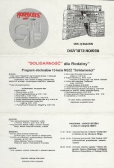 Komitet Organizacyjny NSZZ „Solidarność” Regionu Elbląskiego zaprasza w miesiącu sierpniu 1995 r. na różne imprezy: odczyty, marsze, msze, wystawy, festyny, pikniki i uroczystości związane z jubileuszem obchodów 15-lecia (1980-1995) Solidarności. Na zaproszeniu widnieje program obchodów miast Elbląga, Braniewa, Kwidzyna i Malborka.Prezentowany dokument pochodzi z archiwów przekazanych w darze Bibliotece Elbląskiej przez NSZZ „Solidarność” Elbląg.