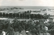 Na zdjęciu port w Gdyni. Gdynia otrzymała prawa miejskie w 1926 roku, a rok później uzyskała status specjalnej strefy ekonomicznej, co spowodowało napływ ludności na te tereny i dalszy rozkwit miasta. W 1938 roku Gdynia stała się najważniejszym i najnowocześniejszym portem na Morzu Bałtyckim i dziesiątym portem w Europie pod względem swej pozycji handlowej. Obecnie port w Gdyni jest trzecim co do wielkości portem morskim w Polsce, zaraz po Gdańsku i Szczecinie. (Karta pocztowa wydana przez „Fotoplastyka”- Sopot).