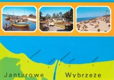 Na zdjęciu trzy miejscowości turystyczne: Jantar (niem. Pasewark), gdzie co roku w okresie wakacji letnich odbywają się tutaj Mistrzostwa Świata w Poławianiu Bursztynu, Mikoszewo (niem. Nickelswalde) oraz Sobieszewo (niem. Bohnsack). Widokówka wydana w 1977 roku przez Krajową Agencję Wydawniczą. Opracowanie graficzne – E. Łukasik, fot. Z. Grabowiecki.
