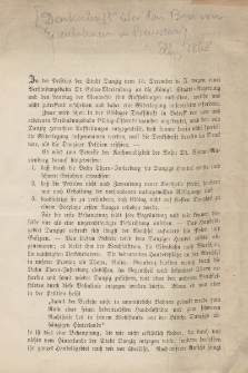 Petycja wystosowana przez elbląskich starszych kupiectwa. Odnosi się ona do petycji gdańszczan, przedłożonej rządowi królewskiemu i pruskiemu sejmowi, w której argumentowali oni, że Gdańsk traci na budowie połączeń kolejowych między miastami prowincji, takimi jak Toruń i Czerniachowsk. Argumenty przytaczane w elbląskiej petycji przeczą temu poglądowi i uzasadniają, że na budowie kolei gdański handel nie ucierpi, a będzie wręcz przeciwnie. Książka współoprawna (klocek) zawierająca druki dotyczące transportu, handlu i przemysłu - „Project einer Eisenbahn Thorn – Königsberg” IV.4.3 – druk VI.