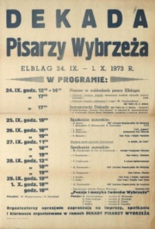 Wojewódzka Biblioteka Publiczna w Elblągu w ramach Dekady Pisarzy Wybrzeża: 1973 zorganizowała wiele wystaw, konkursów i spotkań autorskich. Na zdjęciu afisz zwiastujący obchody, które miały miejsce w województwie elbląskim w dniach 24.09-01.10.1973 r.
