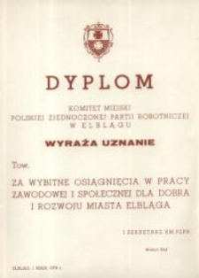 Tytuł: PZPR – dyplom uznania i podziękowania z dnia 1.05.1976 r.