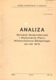 W marcu 1976 r. Urząd Wojewódzki w Elblągu wydał druk pod nazwą -"Analiza sytuacji Gospodarczej i Wykonania Planu Województwa Elbląskiego za rok 1975". Dokument w formie kserowanego maszynopisu, zawierał zarówno na sztywniejszej okładce jak i w wewnętrznej części spisu treści napis - "Do użytku służbowego". Zadrukowano go dwustronnie. Treść podzielono na trzy części - część ogólną, część szczegółową przedstawione w formie opisowej i tablicę syntetyczną pokazujące dane w formie tablicy. W części ogólnej podsumowano wyniki analiz 1975 r. podkreślając, że był to ostatni rok poprzedniej "pięciolatki" (wszak gospodarka socjalistyczna była gospodarką planowaną i sterowaną odgórnie - "plany pięcioletnie", plany lokalne musiały być skorygowane z założeniami planu centralnego - ogólnopolskiego). Zadania planowane wykonano w województwie na ogół pomyślnie, poprawie uległ poziom życia ludności, utrzymano odpowiednia dynamikę rozwoju w działach produkcji materialnej, podkreślono przy tym zwiększenie przychodów pieniężnych ludności. Nastąpiła rozbudowa urządzeń komunalnych, poprawiła się jakość przewozów komunikacji miejskiej oraz uzyskano lepszą jakość pracy. W części szczegółowej opisano dokładniej czternaście zagadnień społeczno-gospodarczych posługując się w niektórych sytuacjach danymi statystycznymi i tabelkami. Te same zagadnienia ale w formie zbiorowej tabeli znalazły się w trzeciej części w tablicy syntetycznej, posiadającą osobną numerację stron.