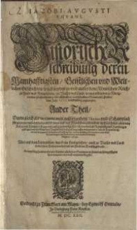 T. 1, 2: Monumentalne dzieło historyczne – kronika wydarzeń europejskich z lat 1516-1604 autorstwa francuskiego historyka Jacques’a Augusta de Thou (1553-1617) (zlatynizowana wersja nazwiska Thuani) [kronikarz posiadał bibliotekę złożoną z 8000 tomów, zwaną Bibliotheca Thuana, na którą składały się dzieła w języku łacińskim]. Dzieło plasuje się w nurcie tzw. „teatrum mundi” (łac. teatr świata), jak w XVI-XVII w. nazywano prace z zakresu historii powszechnej. Dzieło – poza wartością historyczną – miało mieć też wydźwięk moralny, polegający na unaocznieniu jak zmienne i nieprzewidywalne są zrządzenia losu i udowodnieniu, że cnota jest wynagradzana, a zło podlega karze. Historische Beschreibung było opus vitae de Thou i jest zarazem jednym z najważniejszych źródeł do historii Francji okresu renesansu i wojen hugenockich. W 1609 dzieło znalazło się na indeksie ksiąg zakazanych jako sprzyjające protestantyzmowi. Przed kartą tytułową pierwszego tomu frontyspis wykonany w technice miedziorytniczej, przedstawia dwie boginie, u góry aniołki grające na trąbach, u dołu sceny batalistyczne. Układ tekstu dwukolumnowy. Wszystkie karty druku w ramkach. W tekście marginalia ; ozdobniki drukarskie: inicjały winiety ; indeks. Przed kroniką, słowo wstępne drukarza Petera Kopffena. Format bibliograficzny druku: 2. Pieczątki: 1, 3, 10, 11. Dawne sygnatury: C.2, D 1423f. Zewnętrzne oznaczenia: DT. Krawędzie przycięte - barwione ; typ oprawy (materiał) - biały pergamin (oprawa z japem) ; okładziny - tektura ; średnie zabrudzenia ; brak zacieków / zaplamień ; niewielkie ubytki spowodowane przez owady. W 2010 r. druk poddano konserwacji zachowawczej w ramach projektu „Konserwacja zachowawcza druków XV-XVII w. Biblioteki Elbląskiej”.