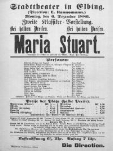 Afisz teatralny tragedii „Maria Stuart” Schillera wystawionej 6 grudnia 1886 roku w elbląskim Teatrze Miejskim, ceny biletów zostały obniżone o połowę.