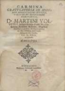 Druk zawiera wiersze gratulacyjne dla Martina Volsciusa z okazji uzyskania tytułu magistra filozofii na Uniwersytecie w Rostocku. Wśród nich znajduje się krótki utwór Johanna Fredera (1544-1604), profesora i rektora uniwersytetu, niemieckiego teologa i poety ; Joachimusa Engelbertusa ; Thomasa Treptoviusa. Wiersze zawierają zwyczajową pochwałę przymiotów duchowych i erudycji magistra oraz gratulacje od ofiarujących je przyjaciół. Druk współoprawny (klocek introligatorski), sygn. Pol.6.II.392-Pol.6.II.6.II.426. Format bibliograficzny: 4. Pieczątki: 1, 5, 10, 11. Dawne sygnatury: N.2., N.2.Misc.2. Zewnętrzne oznaczenia: DT, TD. Typ oprawy (materiał) - biały pergamin; krawędzie przycięte - barwione; okładziny - tektura; zdobienia oprawy - tłoczenia złocone; okładka częściowo oddzielona od bloku; deformacje - niewielkie; niewielkie przedarcia/ubytki; znaczny stopień zainfekowania mikroorganizmami. W 2010 r. druk poddano konserwacji zachowawczej w ramach projektu „Konserwacja zachowawcza druków XV-XVII w. Biblioteki Elbląskiej”.