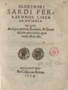 Autor Księgi o monetach Alexander Sardus (ca 1520-1588) przedstawia monety, które były w użyciu od czasów Homera do upadku cesarstwa rzymskiego, uwzględniając podział na monety brązowe, srebrne i złote. Przy oszacowywaniu ich miary, wag i wartości powołuje się na pisarzy starożytnych (bez podawania jednak konkretnych dzieł czy cytatów), m.in. Herodota, Warrona, Pliniusza, Cycerona, Makrobiusza, Julliusza Polluksa, Liwiusza, Plutarcha, Homera, Senekę, Gelliusza, czy Polybiusza. W zakończeniu autor dokonuje zestawienia wartości starożytnych monet według ich oszacowania zgodnego z obowiązującą w czasach autora walutą. Druk współoprawny (klocek introligatorski), sygn. Pol.6.II.1328-Pol.6.II.1361. Format bibliograficzny: 4. Superekslibris: Samuel Meienreis. Pieczątki: 1, 10, 11. Dawne sygnatury: M.5, U.5, Z IIII?. Zewnętrzne oznaczenia: DT; pęknięcie zwięzów między blokiem a oprawą, poluzowanie oprawy, uszkodzenie przegubów; niewielkie deformacje; średnie zabrudzenia/zacieki/zaplamienia; niewielkie ubytki spowodowane przez owady. W 2010 r. druk poddano konserwacji zachowawczej w ramach projektu „Konserwacja zachowawcza druków XV-XVII w. Biblioteki Elbląskiej”.
