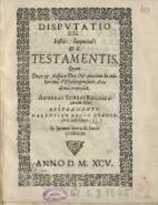 Pismo odnosi się do trzynastej dysputy, która miała miejsce na Akademii w Wittenberdze i dotyczyła zapisów testamentowych w świetle przepisów prawnych. Na forum wypowiadał się Andreas Scheps, któremu w piśmie udzielił odpowiedzi Valentin Regius reprezentujący Akademię we Frankfurcie nad Odrą. Część właściwą pisma poprzedza dedykacja Regiusa, w której dziękuje on swoim protektorom (senatorom z Frankfurtu), mecenasom i ojcu. Z niej dowiadujemy się również, że są to jego młodzieńcze prace (iuvenilia). Pismo jest zbiorem 26 tez, w których autor na początku wyjaśnia, czym jest dziedziczenie w świetle przepisów prawa i czynności prawnych oraz wskazuje na jego różne rodzaje. Po tym objaśnieniu przechodzi bezpośrednio do zagadnień związanych z zapisami testamentowymi (definicja, typy, czynności prawne, przeszkody prawne), odnosząc się do konkretnych zapisów w prawie. W podsumowaniu formułuje z kolei pytania dotyczące możliwości częściowego lub całościowego unieważnienia testamentu i precyzyjności formuł stosowanych w niektórych zapisach. Druk współoprawny (klocek introligatorski), sygn. Pol.6.II.1286-Pol.6.II.1327. Format bibliograficzny: 4. Pieczątki: 1, 10, 11. Dawne sygnatury: G.6. Zewnętrzne oznaczenia: DT. Krawędzie przycięte - barwione; typ oprawy (materiał) - papier; obleczenie - biała skóra, pergamin - czarny z rękopisu; okładzina - tektura; zdobienia oprawy -tłoczenia ślepe; średnie deformacje/ przedarcia/ ubytki; niewielkie ubytki spowodowane przez owady. W druku tenacula - małe karteczki przyklejane do kart, ułatwiające szybkie wyszukiwanie wiadomości w tekście (rodzaj zakładek). W 2010 r. druk poddano konserwacji zachowawczej w ramach projektu „Konserwacja zachowawcza druków XV-XVII w. Biblioteki Elbląskiej”.