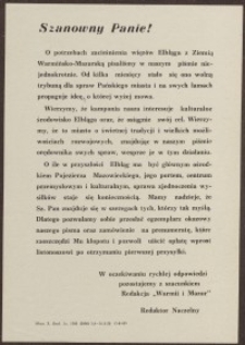 Ulotka wydana przez redakcję miesięcznika "Warmii i Mazur" zachęcająca do prenumeraty regionalnego czasopisma społeczno-kulturalnego. Druk znaleziony w nr 6/1957. Biblioteka Elbląska w swoich zbiorach posiada roczniki 1957-2001 (niekompletne).