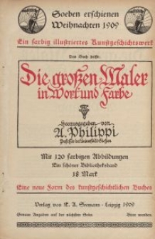 Reklama pracy "Die grossen Maler in Wort und Farbe" (Wielcy malarze. Słowo i obraz) autorstwa profesora uniwersytetu w Giesen Adolfa Philippi (1843-1918) oraz wydanych przez wydawnictwo prac "Galerie Europy", "Mistrz koloru" oraz serię "Słynne miasta sztuki: Drezno, Naumburg, Merseburg, Trier. Na ostatniej stronie wykaz 45 wcześniej wydanych publikacji. Do ulotki dołączona jest karta pocztowa z tytułami oraz ich cenami. Reklama drukowana przez oficynę "Pöschel & Trepte" w Lipsku. Ulotka dołączona do tygodnika niemieckiego "Die Zukunft" 1909 nr 11, sygn. 010277.