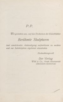 Wydawnictwo "Verlag Wild & Co. Graph. Kunstanstalt" w Dreźnie reklamuje Serię I : "Berühmte Skulpturen in Bild und Wort" (Słynne rzeźby. Słowo i obraz). Dostawą zamówionych publikacji zajmowała się Firma F. Volckmara z Lipska. Na zdjęciu w ulotce - Apollo Belwederski – rzymska rzeźba pochodząca prawdopodobnie z II wieku, będąca kopią wykonanego w IV wieku p.n.e. greckiego oryginału dłuta Leocharesa. Rzeźba wykonana jest z marmuru i mierzy 2, 24 metra wysokości (obecnie znajduje się w Muzeach Watykańskich). Ulotka dołączona do tygodnika niemieckiego "Die Zukunft" 1910 nr 14, sygn. 010277.