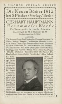 Oferta nowych książek na 1912 rok prezentowana przez wydawnictwo "Samuel Fischer Verlag" z Berlina (powieści, nowele, książki podróżnicze, m.in. "Ameryka" Arthura Schnitzlera ; dzieła zebrane Gerharda Hauptmanna ; Hermana Banga ; Hermanna Hesse ; Arthura Holitschera i wielu innych). Ulotka zawiera recenzje, które ukazały się w niemieckich czasopismach (Der Tag, Vossische Zeitung, berliner Tageblatt, Neue Freie Presse), zdjęcia oraz ceny poszczególnych wydań. Drukiem prospektu zajęła się oficyna Oscara Brandstettera w Lipsku. Ulotka dołączona do tygodnika niemieckiego "Die Zukunft" 1912 nr 9, sygn. 010277.