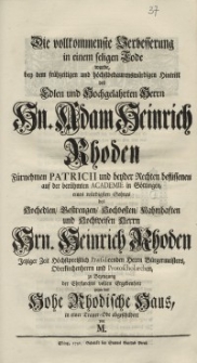 Oda napisana na okoliczność śmierci Adama Heinricha Rhode, który zmarł 11 maja 1751 r. (w wieku 22 lat), w czasie studiów w Getyndze. Zmarły był jedynym synem elbląskiego burmistrza Heinricha Rhode. Druk funeralny jest wyrazem współczucia dla ojca i rodziny Rhode. Druk współoprawny z innymi drukami okolicznościowymi (mowy, wiersze, kantaty, druki żałobne, weselne itp.).