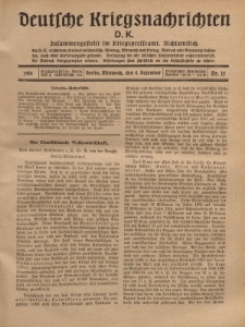 "Deutsche Kriegsnachrichten. D. K. Zusammengestellt im Kriegspresseamt. Nichtamtlich" - niemieckie aktualności wojenne, korespondencja i reportaże z działań I wojny światowej oraz ogólne wiadomości ze świata. Gazeta ukazywała się trzy razy w tygodniu: w poniedziałki, środy i piątki. Czasopismo wydawane na niskiej jakości papierze, ale mimo ograniczeń związanych z papierem, w drukarniach - większość stron drukowana nieoszczędnie (co druga karta pusta). Paginacja w obrębie poszczególnych numerów, natomiast numeracja zeszytów ciągła dla wszystkich roczników. W numerach poniedziałkowych ukazywał się dodatek "Deutsche Marine=Nachrichten...", w środy od września 1918 dodatek "Nachrichten der Luftstreitkräfte..." (oba dodatki z własną numeracją oraz paginacją). Biblioteka Elbląska w swoich zbiorach posiada roczniki z lat 1916-1918.