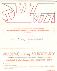 Wojewódzki Komitet Frontu Jedności Narodu w Elblągu oraz Wojewódzki Zarząd Towarzystwa Przyjaźni Polsko-Radzieckiej w Elblągu zapraszają 5. listopada 1977 r. o godz. 17 do Teatru Dramatycznego w Elblągu na akademię z okazji 60 rocznicy Rewolucji Październikowej. W programie przewidziano referat okolicznościowy oraz koncert w wykonaniu Zespołu Pieśni i Tańca z Kaliningradu oraz aktorów Teatru Dramatycznego w Elblągu. Zaproszenie imienne dla Pani Alicji Bednarczuk.