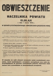 W dniu 1 marca 1975 roku Naczelnik Powiatu Elbląg wystosował do mieszkańców Elbląga i okolic Obwieszczenie. Treścią tego dokumentu były ostrzeżenia w zakresie przestrzegania przepisów przeciwpożarowych w szczególności zakazu wypalania traw, rozpalania ognisk i używania ciągników bez zabezpieczenia rur wydechowych. Takie afisze od władz administracyjnych szczebla wojewódzkiego czy instytucji odpowiedzialnych za bezpieczeństwo przeciwpożarowe były na porządku dziennym, stąd w naszych zbiorach można je odszukać i zapoznać się z nimi. Pod dokumentem widnieje podpis Naczelnika Powiatu inż. Henryka Diffenbacha.