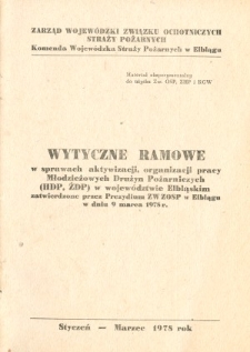 Zarząd Wojewódzki Związku Ochotniczych Straży Pożarnych (ZW ZOSP ) w Elblągu, Komenda Wojewódzka Straży Pożarnych w Elblągu wydał w 1978 roku, bardzo ciekawy dokument o pełnej nazwie - "Wytyczne ramowe w sprawach aktywizacji, organizacji pracy Młodzieżowych Drużyn Pożarniczych (HDP, ŻDP) w województwie Elbląskim zatwierdzone przez Prezydium ZW ZOSP w Elblągu w dniu 9 marca 1978 r." Przy czym skrót HDP - oznaczał Harcerską Drużynę Pożarniczą a ŻDP - oznaczał Żeńską Drużynę Pożarniczą. Na okładce zaznaczono, iż druk stanowi - "Materiał eksperymentalny do użytku Zw. OSP, ZHP (Związek Harcerstwa Polskiego) i KGW (Koło Gospodyń Wiejskich)". Informacje zawarte w nim stanowiły propagandę, podręcznik pracy oraz całokształt zagadnień związanych z prowadzeniem Młodzieżowych Drużyn Pożarniczych (MDP). Obejmowały m.in. dokumentację drużyny, plany jej pracy, życie wewnętrzne drużyny, przygotowanie do zlotów drużyn oraz prasę i wydawnictwa pożarnicze. Motywem przewodnim była propaganda - przygotowanie aktywu do uczestniczenia w obozach instruktorskich dowódców MDP. Młodzież stanowiła organizację paramilitarną, w której ćwiczono przedmioty pożarnicze na przemian z zajęciami musztry, nauką oddawania honorów czy strzelectwem. Wiedzą na temat tamowania krwotoków oraz ćwiczeniami związanymi z alarmami lotniczymi. Dokument stanowi niezwykły przykład schyłku propagandy socrealizmu końca lat 70-tych.