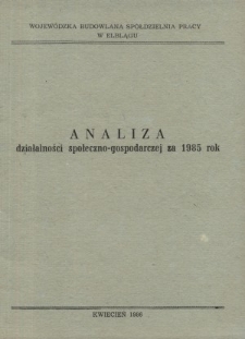 W kwietniu 1986 roku powstał dokument - "Analiza działalności społeczno-gospodarczej za 1985 rok." Treść przygotował Zarząd Wojewódzkiej Budowlanej Spółdzielni Pracy w Elblągu (WBSP). W naszych zbiorach Dokumentów Życia Społecznego posiadamy jeszcze sprawozdania z jej działalności z roku 1977 i 1979 oraz analizy działalności z lat 1985 (w tym roku przypadło 40-lecia działalności spółdzielni) i 1986. W 10 stronicowym raporcie przedstawiono 9 tematów wiodących, m.in. realizację zadań gospodarczych. Spółdzielnia dysponująca trzema zakładami pracy (246 pracowników) wypracowała w roku 1985 kwotę 268.426 tys. zł z planowanych 228.101 tys. zł. W opracowaniu zabrakło profilu produkcji i usług, poruszono natomiast kwestie struktury zatrudnienia i zagadnienia kadrowe, gospodarkę materiałową i gospodarkę zapasami, inwestycje własne (w tym zakup sprzętu biurowego, urządzeń i samochodów). Piąty rozdział dotyczył gospodarki transportowo-sprzętowej, szósty wyników finansowych i stanu finansowego a siódmy Bezpieczeństwa i Higieny Pracy. W ósmym poruszono sprawy socjalno-bytowe gdzie w stosunku do 1979 zwiększono nakłady do sumy 1.331 tys. zł zbliżając się do wartości z 1977 roku (1.320 tys. zł). W ramach dopłat do kolonii oraz obozów dla dzieci sfinansowano pobyt dzieci w Bułgarii i Czechosłowacji. Ostatnim omawianym punktem była działalność statutowych organów samorządowych. Inaczej jak w dwóch poprzednich pod dokumentem podpisał się cały 5 osobowy skład Zarządu Spółdzielni, Henryk Popowski, Piotr Wiewiórski, Zygmunt Kłosowski, Józef Wołk i Hubert Winiarski.