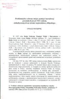 W związku z obchodzonym 50leciem działalności Rady Ochrony Walk i Męczeństwa- Wydział Kultury, Sportu i Turystyki Wydziału Wojewódzkiego w Elblągu 18.03.1997 r. wydał zestawienie dotyczące ochrony miejsc pamięci narodowej powstałych przed 1945, zlokalizowanych na terenie województwa elbląskiego. Rada przez wszystkie lata zajmowała się problematyką związaną z upamiętnianiem historycznych wydarzeń oraz zasłużonych postaci (opieka nad cmentarzami wojennymi, pomnikami, grobami). Wydany dokument zawiera rozporządzenia, rys historyczny oraz priorytety jakie należy stosować aby zachować wszystkie upamiętnienia. Do dokumentu dołączono listę z wykazem 54 miejscowości oraz lokalizacją i stanem technicznym opisanych obiektów. Autor opracowania - Dariusz Barton w dokumencie podkreśla ważność opieki nad pozostałymi znakami pamięci narodowej, szukania środków pozabudżetowych dla prac konserwatorskich i rewaloryzacyjnych. Biblioteka Elbląska w swoich zbiorach posiada dużą kolekcję (ponad 130 skoroszytów) kart ewidencyjnych miejsc pamięci narodowej.