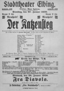 Afisz teatralny dramatu „Kocia kładka“ autorstwa związanego z Elblągiem pisarza Hermanna Sudermanna. Sztukę wystawiono w elbląskim Teatrze Miejskim 27 stycznia 1920 r.
