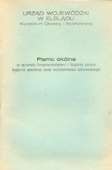 Dokument wydany przez Kuratorium Oświaty i Wychowania Urzędu Wojewódzkiego w Elblągu dotyczył Bezpieczeństwa i Higieny Pracy w placówkach przeznaczonych do kontaktów z młodzieżą. W treści dokumentu znajdowały się 2 rozdziały - Bezpieczeństwo i Higiena Pracy oraz Higiena szkolna. W pierwszym liczącym 16 punktów, przypomniano procedury - związane z obowiązkami pracowników szkół i innych placówek, z odpowiednim przeszkoleniem pracowników, z wypadkami uczniów i ich ewidencją, wypadkami pracowników i ich okolicznościami. Punkt piąty rozdziału dotyczył środków czystości, kolejny odzieży roboczej i ochronnej oraz sprzętu ochrony osobistej pracowników a siódmy bezpieczeństwa ruchu drogowego itp. W ostatnim szesnastym bardziej rozbudowanym przybliżono ochronę przeciwpożarową. Rozdział drugi dotyczący Higieny szkolnej nie był podzielony na podpunkty i zajmował sporo miejsca w dokumencie. Kładziono w nim szczególny nacisk na funkcjonowanie urządzeń sanitarnych (ubikacji) oraz śmietników, stanowiących "pietę Achilesową" placówek szkolnych. Jak podkreślono w dokumencie, kontrole wykazał, "że stan techniczny wielu z nich jest niedostateczny a intensywna eksploatacja ustępów powoduje, że ulegają one bardzo szybko zniszczeniu". Dyrektorzy zobowiązani są by ubikacja powinna być wizytówką szkoły a w szkole funkcjonowały śmietniki (do tej pory kilka szkół było ich pozbawionych). W szkole, szczególnie wiejskiej, powinna być doprowadzona woda pitna a we wszystkich typach szkołach rozwijana higiena osobista uczniów. Poruszono także sprawę oświetlenia, odpowiednio przystosowanych ławek i równomiernego obciążenia nauką dzieci. Pod dokumentem podpisał się Starszy Wizytator BHP mgr Janusz Malanowski. Częścią materiału był załącznik nr 2 - wzór protokołu ustalenia okoliczności i przyczyn wypadku przy pracy. W zbiorach Dokumentów Życia Społecznego znajduje się jeszcze inny dokument z roku 1976, związany z bezpieczeństwem i higieną pracy w elbląskiej oświacie - "Pismo okólne w sprawie szkolenia BHiP".