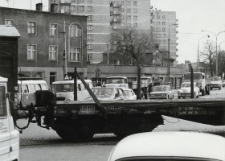 Zdjęcie z 2. maja 1976 r. autorstwa Leonarda Poczwajtisa z Elbląga przedstawia fragment ulicy Grunwaldzkiej. Na pierwszym planie widać przejeżdżający pociąg z platformą (bez ładunku). Tory kolejowe przecinające Elbląg do lat 80. XX wieku były nieodłącznym elementem tamtejszej infrastruktury, a pociągi przejeżdżające przez środek miasta stanowiły codzienny widok. Od 7. września 1899 roku ze względu na specyficzne położenie torów i brak odpowiednich systemów sygnalizacyjnych w czasie przejazdu kolei obowiązywały szczególne obostrzenia. Pociąg poruszał się z maksymalną prędkością 5 km/h, zaś przed lokomotywą szedł specjalny pracownik kolejowy z czerwoną chorągiewką (lub lizakiem kolejowym) i gwizdkiem. W tym czasie pozostały ruch był wstrzymywany.