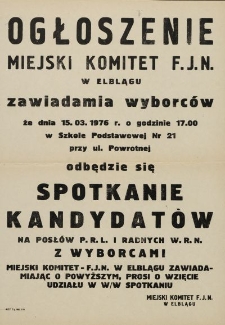 | 1976, Ogłoszenie Miejski Komitet F.J.N w Elblągu Zawiadamia Wyborców Że Dnia 15.03.1976 ... - afisz | 24 lis 2017 |