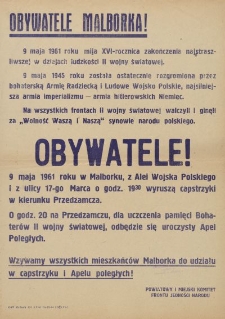 Miejski i Powiatowy Komitet Frontu Jedności Narodu (M i PK FJN) w Malborku zorganizował z okazji Dwudziestej Szóstej Rocznicy Zakończenia II Wojny Światowej capstrzyk i Apel poległych. MK i PK FJN w Malborku wezwał wszystkich mieszkańców Malborka do udziału w tych imprezach. Uroczystości odbyły się 09.05.1961 r. w Malborku, przemarsze capstrzyku rozpoczęły się na ulicach Aleja Wojska Polskiego i 17-go Marca o godz. 19.30 i kierowały się na Podzamcze Zamku w Malborku. Tam o godz. 20.00 odbył się uroczysty Apel poległych dla uczczenia pamięci Bohaterów II Wojny Światowej. W naszych zbiorach jest sporo dokumentów związanych z akcjami wyborczymi, organizowaniem obchodów czy akcjami społecznymi przygotowywanymi przez Front Jedności Narodu możemy się z nimi zapoznać na naszym Wortalu wpisując takie hasła jak - "Obwieszczenie", "Ogłoszenie", "Program", "Front Jedności Narodu", "Uroczysta", "Manifestacja" czy "Terminarz".