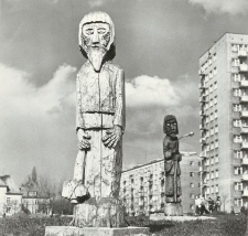 Na zdjęciach trzy wysokie drewniane słupy z postaciami ludowymi ustawione na placu między wieżowcami ulicy Nowowiejskiej w Elblągu. Artyści ludowi swoje rękodzieła promują nie tylko w obiektach zamkniętych, ale również na wolnym powietrzu. Niektóre rzeźby zapisały się na stałe w historii Elbląga np. formy przestrzenne. Swoją sztuką artyści wzbogacili krajobraz elbląskiej przestrzeni artystycznej, a wszystkie formy, te ustawione na stałe lub tymczasowo służyły promocji Elbląga pod kątem rozpoznawalności.