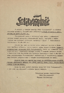 Prezydium Zarządu Regionalnego NSZZ "Solidarność" Regionu Elbląskiego rozpowszechniało ulotki proklamujące, iż w dniach 19-20.08.1981 r. odbędzie się strajk drukarzy i poligrafów. Powołując się na pkt. 3. zawartych porozumień gdańskich z dnia 31.08.1980 r., gdzie działalność radia i telewizji, prasy i wydawnictw powinna służyć wyrażaniu różnorodnych myśli i poglądów, nie powinna być kontrolowana przez władze rządowe - szczególnie w kampaniach propagandowych przeciwko NSZZ "Solidarność". W dalszej części ulotki wymieniane są zarzuty oraz przytaczane przykłady kłamliwych informacji. Ulotka pochodzi ze zbiorów NSZZ „Solidarność”- Elbląg, przekazana w darze Bibliotece Elbląskiej.