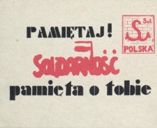 Ulotka w formie karty pocztowej rozpowszechniana przez NSZZ "Solidarność" w Elblągu, z hasłem "Pamiętaj ! Solidarność pamięta o tobie". Kartka pochodzi ze zbiorów NSZZ „Solidarność”- Elbląg, przekazana w darze Bibliotece Elbląskiej.