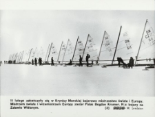 Autor zdjęcia : KAW - W. Lendzion, W : Miesięczna Kronika Fotograficzna : województwo elbląskie – luty – 1978 r. (Nr 2/78). Gdańsk. Wydaw. : Krajowa Agencja Wydawnicza. Format : 23,8 x 18,3 cm. Na zdjęciu zawodnicy ze swoimi bojerami na Zalewie Wiślanym. W dniu 11 lutego 1978 roku zakończyły się w Krynicy Morskiej Mistrzostwa Świata i Europy w tej zimowej dyscyplinie sportowej.