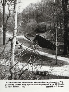 Autor zdjęcia : KAW - P. Kajmer, W : Miesięczna Kronika Fotograficzna : województwo elbląskie – maj – 1978 r. (Nr 5/78). Gdańsk. Wydaw. : Krajowa Agencja Wydawnicza. Format : 18,2 x 24,0 cm. Na zdjęciu widać otoczony drzewami o świeżo rozwiniętych pąkach, malowniczy stopień wodny w miejscu zwanym przez elblążan Park Dolinka lub Dolinka. Oficjalna nazwa to Park XXV-lecia PRL, na alejach spacerowych widać ludzi cieszących się darami natury.