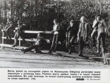 Autor zdjęcia : KAW - G. Baranowski, W : Miesięczna Kronika Fotograficzna : województwo elbląskie – listopad – 1978 r. (Nr 11/78). Gdańsk. Wydaw. : Krajowa Agencja Wydawnicza. Format : 24,1 x 18,2 cm. Na zdjęciu widać grupę turystów opalających się w jesiennym słońcu na tle drewnianego mostku ze ścianą lasu.