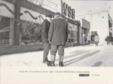 Autor zdjęcia : KAW - W. Amerski, W : Miesięczna Kronika Fotograficzna : województwo elbląskie – styczeń – 1979 r. (Nr 1/79). Gdańsk, Wydaw. : Krajowa Agencja Wydawnicza. Format : 27,8 x 20,8 cm. Na zdjęciu widać dwóch mieszkańców Elbląga, jeden trzyma świeżo zakupioną choinkę. Romawiających na tle zimowej szaty opatulającej ciąg sklepów, wzdłuż ulicy 12 Lutego w Elblągu, widoczny sklep WSS "Społem" oraz księgarnię "Dom Książki".