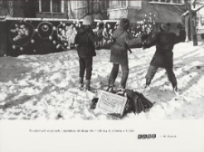 Autor zdjęcia : KAW - W. Amerski, W : Miesięczna Kronika Fotograficzna : województwo elbląskie – luty – 1979 r. (Nr 2/79). Gdańsk, Wydaw. : Krajowa Agencja Wydawnicza. Format : 27,9 x 20,8 cm. Zdjęcie przedstawia rzucających snieżkami, trzech chłopców w budynek na roku ulicy Trybunalskiej i Słonecznej. W tle po prawej niewielki, widoczny ciąg sklepów przy ulicy 12 Lutego ze modnym sklepem "Świat Dziecka". Obok chłopców leżą porzucone teczki oraz album do rysowania, charakterystyczna "Teczka Rysunkowa" z piórem.