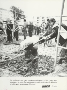 Autor zdjęcia : KAW - D. Bocian (na fotogramie podano błędnie imię), W : Miesięczna Kronika Fotograficzna : województwo elbląskie – październik – 1979 r. (Nr 10/79). Gdańsk, Wydaw. : Krajowa Agencja Wydawnicza. Format : 20,8 x 27,9 cm. Na zdjęciu widać członków partii - PZPR (Polska Zjednoczona Partia Robotnicza), PSL (Polskie Stronnictwo Ludowe), SD (Stronnictwo Demokratyczne) województwa elbląskiego w trakcie wykonywania tzw. czynu społecznego (partyjnego). Od roku 1973 organizowano takie czyny, aby wesprzeć lokalną gospodarkę lub działać na rzecz lokalnej społeczności, angażowano również w te czynności bezpartyjnych. W dniu 23 września 1979 roku w ramach takiego czynu uczestniczyło 35 tys. członków partii województwa elbląskiego.