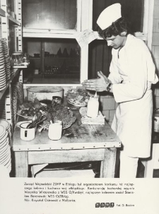 Autor zdjęcia : KAW - D. Bocian, W : Miesięczna Kronika Fotograficzna : województwo elbląskie – grudzień – 1979 r. (Nr 12/79). Gdańsk, Wydaw. : Krajowa Agencja Wydawnicza. Format : 20,9 x 27,9 cm. Zdjęcie przedstawia Krzysztofa Ostrowskiego z Malborka podczas pracy, kucharza biorącego udział w konkursie w 1979 roku na najlepszego kelnera i kucharza województwa elbląskiego. Konkurs został zorganizowany przez Zarząd Wojewódzki Związku Socjalistycznej Młodzieży Polskiej w Elblągu najlepszym kucharzem okazała się Weronika Wiktorowska z Wojewódzkiej Spółdzielni Spożywców "Społem" w Kwidzyniu a najlepszym kelnerem konkursu został Stanisław Baranowski z Wojewódzkiej Spółdzielni Spożywców "Społem" w Elblągu.