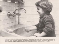 Zdjęcie pochodzi z archiwum KAW, W: Miesięczna Kronika Fotograficzna : województwo elbląskie – lipiec – 1980 r. (Nr 7/80). Gdańsk, Wydaw.: Krajowa Agencja Wydawnicza. Format: 28 x 21 cm. Na zdjęciu dziewczynka myjąca ręce przed posiłkiem. Zdjęcie nawołuje do kontrolowania przez rodziców czystości rąk przed posiłkami. W czasie kolonii letnich dzieci nie nauczone czystości padają najczęściej ofiarą własnych przewodów pokarmowych.