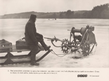 Autor zdjęcia : R. Czerniewski, W: Fotorelacje Elbląskie (kontynuacja wydawanej Miesięcznej Kroniki Fotograficznej) – grudzień – 1981 r. (Nr 12/81). Gdańsk, Wydaw.: Krajowa Agencja Wydawnicza. Format: 28,1 x 21,1 cm. Na zdjęciu widać jezioro skute lodem, w którym wykonano planowane przeręble, przy niektórych stoją samojezdne "po lodzie" wyciągarki sieci (specjalne kołowrotki), do których podpięto wielkie sanie z pustymi skrzyniami na ryby. Na pierwszym planie "lodowy" rybak kontroluje proces opuszczania sieci do przerębla, siedząc na saniach ze skrzyniami. W kryzysowym 1981 roku napełnianie skrzyń złowionymi rybami, trwało na pewno krócej niż stanie w sklepie w kolejce aby je nabyć.