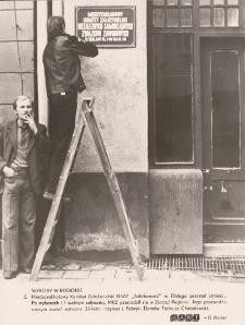 Autor zdjęcia : D. Bocian, W: Fotorelacje Elbląskie (kontynuacja wydawanej Miesięcznej Kroniki Fotograficznej) – sierpień – 1981 r. (Nr 8/81). Gdańsk, Wydaw.: Krajowa Agencja Wydawnicza. Format: 20,9 x 27,9 cm. Zdjęcie przedstawia likwidację tablicy informacyjnej Międzyzakładowego Komitetu Założycielskiego (MKZ) NSZZ "Solidarność". Po wyborach regionu elbląskiego i I Walnym Zebraniu przekształcono MKZ w Zarząd Regionu, jego przewodniczącym został 33-letni inżynier z Fabryki Domów Tadeusz Chmielewski.
