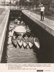 Autor zdjęcia : E. Pawłowski, W: Fotorelacje Elbląskie (kontynuacja wydawanej Miesięcznej Kroniki Fotograficznej) – sierpień – 1981 r. (Nr 8/81). Gdańsk, Wydaw.: Krajowa Agencja Wydawnicza. Format: 21 x 28 cm. Na zdjęciu rzadki widok w 1981 roku - duża zorganizowana grupa kajakarzy, czeka na wyrównanie się poziomów wody na śluzie Miłomłyn w ciągu wodnym Kanału Elbląskiego. Ówczesny kryzys gospodarczy i zaopatrzeniowy znacznie ograniczył indywidualną mobilność turystyczną. Podobna sytuacja dominowała w nadmorskich domach wczasowych, które świeciły także pustkami.