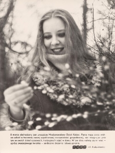 Autor zdjęcia : KAW - K. Andryszkiewicz,W: Miesięczna Kronika Fotograficzna : województwo elbląskie – marzec – 1980 r. (Nr 3/80). Gdańsk, Wydaw.: Krajowa Agencja Wydawnicza. Redaktor wydania: Ewa Jurkowska. Format: 20,8 x 28 cm. Na zdjęciu widać ubrano ciepło piękną modelkę, na tle wiosennego krajobrazu, drzew pozbawionych liści, trzymającą gałązkę wierzbową "kotków". Zdjęcie przypominało o dniu 8 Marca - Międzynarodowym Dniu Kobiet, kobiety według standardów PRL-u stopniowo polepszały swoją pozycje w społeczeństwie, nie rezygnując z pracy w domu. Autorzy zdjęcia proponują wszystkim kobietom wręczenie kwiatka, serdeczne życzenia oraz słowa uznania.
