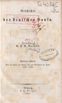 Trzecia, ostatnia część obszernego dzieła niemieckiego historyka Friedricha Wilhelma Bartholda (1799-1858) w sposób szczegółowy prezentującego historię powstania, rozwoju i funkcjonowania niemieckiej Hanzy, wydana w Lipsku w 1854 roku. Niniejsza część opracowania w chronologicznie uporządkowany i drobiazgowy sposób przedstawia kwestie rozwoju i działalności Hanzy a następnie stopniowej utraty jej wpływów, która w efekcie doprowadziła do ostatecznej likwidacji organizacji, na tle wydarzeń historycznych w okresie 1397-1630. Liga Hanzeatycka w okresie XIV - XV wieku gromadziła praktycznie wszystkie miasta pobrzeża Morza Północnego i Bałtyckiego, niepodzielnie władając handlem na tych obszarach, stanowiąc prawa, ustalając cła, reguły handlu etc. W szczytowym okresie rozwoju Hanza liczyła około 160 miast pod przewodnictwem Lubeki. Od drugiej połowy XV wieku i w XVI wieku zaznaczył się jej powolny upadek, wynikający m.in. ze zmian politycznych i gospodarczych, konkurencji Holandii, Anglii oraz połączonych unią kalmarską państw skandynawskich jak również powstających coraz częściej sprzeczności interesów poszczególnych miast, członków związku. W XVII wieku nastąpił całkowity upadek Hanzy. W zbiorach Biblioteki Elbląskiej znajduje się część I dzieła - opatrzona sygnaturą 35224a oraz II - opatrzona sygnaturą 35224b.