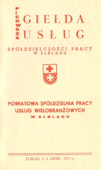 W dniach 2-5 lipca 1975 roku odbyła się Pierwsza Giełda Usług Spółdzielczości Pracy w Elblągu, właśnie z tej imprezy pochodzą trzy reklamówki poświęcone Powiatowej Spółdzielni Pracy Usług Wielobranżowych (PSPUW) w Elblągu, Usługowym Spółdzielniom Pracy w Elblągu i Usługowym Spółdzielniom Pracy w Kwidzyniu i Malborku. W tych nieocenionych broszurach znajdziemy bardzo dużo dokładnych informacji na temat ich działania jak również zakresu usług które oferowały. W tej dotyczącej Powiatowej Spółdzielni Pracy Usług Wielobranżowych w Elblągu odnajdziemy adres i telefon siedziby Zarządu mieszczącej się przy ulicy 1-go Maja 45, adresy i telefony podporządkowanych mu poszczególnych Zakładów wymienionych rodzajami usług, mieszczących się zarówno w Elblągu jak i w innych miejscowościach dawnego województwa elbląskiego. W skład Wielobranżowej Spółdzielni wchodziły Zakłady Usługowe Spółdzielni składające się z określonych branży - Zakłady Stolarskie (ten z ulicy Warszawskiej 11, ten z ulicy Armii Czerwonej 127 (obecnie Królewieckiej) czy te z innych miejscowości: z Tolkmicka z ulicy Szkolnej 3, z Komorowa i z Kmiecina. Oferując usługi w zakresie stolarki budowlanej jak i na zamówienie budując domki campingowe, altanki działkowe oraz parkany drewniane czy listwowe. Spółdzielnia posiadała również Zakłady Tapicersko-rymarskie - z Elbląga wymieniono zakład z ulicy Warszawskiej 11, z ulicy Kościuszki 13 i z Armii Czerwonej 127. W skład wchodziły też zakłady tapicerskie ze Stegny i Tolkmicka. Tapicerka dotyczyła naprawy mebli, jak i konstrukcję taboretów lub pufów a nawet materacy podano również informację o naprawie tapicerki samochodowej. W skład usług rymarskich wchodziła naprawa namiotów, plecaków, wykonanie uprzęży konnej, smyczy i szelek dla psów oraz naprawa teczek szkolnych i toreb skórzanych. Ważnym działem były Zakłady Wulkanizacyjne z Elbląga z ulicy Parkowej 23, z Punktu przyjęć opon do bieżnikowania Malbork - Kałdowo "Autoserwis" czy z Punktu przyjęć opon do bieżnikowania w Sztumie. W zakres świadczonych usług wchodziły również naprawy materacy gumowych i gumowego obuwia. W reklamówce omówiono szczegółowo zakłady usługowe z Elbląga i okolicy - elektrotechniczne, radiowo-telewizyjne, pralnictwa i chemicznego czyszczenia garderoby, fryzjersko-kosmetycznych. Tu także znajdziemy informacje na temat jednego Zakładu Usług Porządkowych mającego siedzibę w Elblągu przy ulicy 1-go Maja 45 zajmującego się także cyklinowaniem parkietów metodą bezkurzową jak i myciem okien. Również z tych samych targów usług pochodzą dwa inne dokumenty znajdujące się w zbiorach Biblioteki Elbląskiej - "Pierwsza Giełda Usług Spółdzielczości Pracy w Elblągu - zaproszenie" oraz "Giełda Usług - afisz".