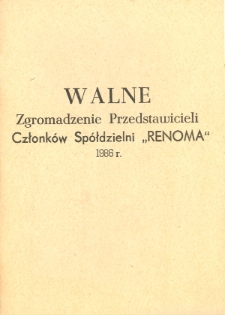 Broszura z 1986 roku związana z Walnym Zgromadzeniem Przedstawicieli (WZP) Spółdzielni "Renoma" jest podobna do tej z 1981 roku. Ze względu na statutową działalność spółdzielni wymagała ona, corocznego zebrania się wszystkich spółdzielców. Podczas takich spotkań abrobowano lub nie politykę gospodarczą Zarządu Spółdzielni. Miało to wpływ na obsadę stanowisk Zarządu, ustalano zyski, dzielono je oraz przyjmowano nowy plan produkcji na następny rok. Czasami uchwalano sposób ustalania nadwyżek, podziału nagród dla wyróżniającego się aktywu spółdzielczego czy przyjmowania nowych kandydatów. Kiepska jakość druku dokumentu sprawia trudności z odczytaniem jej zawartości. Znajdziemy tam Sprawozdanie Rady Nadzorczej Spółdzielni za miniony okres, Sprawozdanie z wykonania Uchwał Dorocznego Walnego Zgromadzenia (w tym ustalenia składu osobowego trzech komisji - Rewizyjnej, Ekonomicznej, Samorządowo-organizacyjnej). Właściwe sprawozdanie Zarządu Spółdzielni zawierało zagadnienia - Działalność organizacyjno-samorządową, Sprawy pracownicze, Zaopatrzenie i gospodarkę materiałową, Produkcję oraz Wyniki finansowe. Z tych ostatnich wynikało, iż firma zarobiła 843 mln złotych, przekraczając plan wyższy od założonego o 106,1%. W dokumencie znajdziemy również Regulamin Walnego Zgromadzenia aby ułatwić zwykłym członkom poruszanie się w gąszczu przepisów prawnych, podczas trwania Zgromadzenia. Na stronie 40-tej wydrukowano Protokół z Walnego zebrania z 22 marca 1986 roku, które miało miejsce o godzinie 11.00 w sali dawnego Klubu OSWL im. Rodziny Nalazków w Elblągu przy ówczesnej ulicy Amii Czerwonej (dziś Królewieckiej). Z treści dowiadujemy się m.in. o przyjęciu regulaminu obrad W.Z.P., o przyjęciu i zatwierdzeniu protokołu z poprzedniego Walnego zgromadzenia, o zatwierdzeniu sprawozdania Zarządu ze swojej działalności oraz przejęciu nowego planu na przyszły rok. Przejęto również sprawozdanie z działalności rady Nadzorczej i sprawozdanie finansowe za 1985 roku, łącznie przyjęto 12 uchwał.