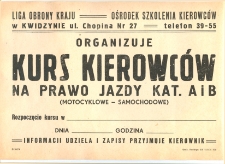 Liga Obrony Kraju (LOK) stowarzyszenie współpracujące z MON, powstałe w okresie PRL jako organizacja paramilitarna. Mająca na celu umacnianie obronności Rzeczypospolitej Polskiej oraz ugrupowania ludzi gotowych do jej obrony, przede wszystkim na potrzeby wojska, zajmująca się także szkoleniem kierowców. Oddział w Kwidzynie i podległy mu Ośrodek Szkolenia Kierowców w Kwidzynie przy ulicy Chopina 27 wydał afisz zawiadamiający o zorganizowaniu kursu kierowców w 1977 roku. Kurs dotyczył nauki w zakresie prawa jazdy na dwie kategorie A i B ("motocyklowe" i samochodowe). Informacji o kursie i zapisu dokonywał kierownik placówki. Afisz jest "czysty" (niezadrukowany), posiadający miejsca do wypełnienia, więc kiedy, którego dnia i o której godzinie nie wiemy. Informacja o roku, też jest niepewna, gdyż występuje tylko na tylnej stronie, wpisana ołówkiem w momencie przyjęcia na stan biblioteki.