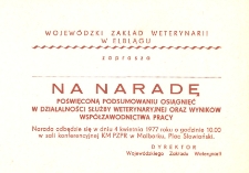 Wojewódzki Zakład Weterynarii w Elblągu zorganizował naradę w dniu 4 kwietnia 1977 roku o godzinie 10.00 w sali konferencyjnej KM (Komitetu Miejskiego) PZPR (Polskiej Zjednoczonej Partii Robotniczej) w Malborku przy Placu Słowiańskim (w Malborku). Narada poświęcona została podsumowaniu osiągnięć w działalności służby weterynaryjnej oraz wyników współzawodnictwa pracy. Zaproszenie posiada miejsce na jedno nazwisko, a na odwrociu znajduje się charakterystyczny stylizowany emblemat służby weterynaryjnej. Porządek narady wydrukowany na zaproszeniu przewidywał - otwarcie, powitanie i powołanie prezydium, wręczenie odznaczeń ZL i TW. Następnie doc. dr hab. Marian Królak z Instytutu Weterynarii w Gdańsku wygłosił referat - "Możliwości ochrony hodowli bydła przed nawrotem brucelozy". Po referacie organizatorzy przewidzieli przerwę po której Wojewódzki Lekarz Weterynarii zaznajomił zebranych z "Oceną stanu zdrowotnego zwierząt, oraz zadań służby weterynaryjnej województwa elbląskiego wynikające z Uchwał VI Plenum KC PZPR (Komitetu Centralnego Polskiej Zjednoczonej Partii Robotniczej)". Później miały miejsce najbardziej oczekiwane przez zebranych chwile - przedstawienie wyników współzawodnictwa pracy i związane z tym wręczenie nagród. Po dyskusji nastąpiło oficjalne zakończenie narady.