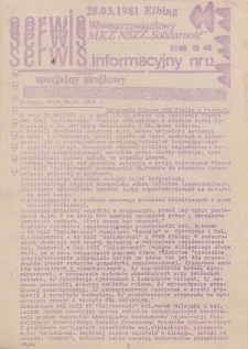 Wewnątrzzwiązkowy Serwis Informacyjny MKZ NSZZ "Solidarność" od dnia 20.03 do 31.03.1981 roku w całości (wszystkie numery do nr 15) był poświęcony tzw. wydarzeniom bydgoskim i sytuacji jak wytworzyła się po tych faktach, w wyniku, których nastąpiła groźba strajku generalnego. Stąd w podtytule serwisu wpis - Wydanie Specjalne Strajkowe. W dniu 19 marca 1981 roku podczas Wojewódzkiej Rady Narodowej w Bydgoszczy dotyczącej sytuacji rolników indywidualnych w obecności wicepremiera Stanisława Macha pobito kilku działaczy "Solidarności" - Michała Bartoszcze i Mariusza Łabentowicza a także szefa regionu Jana Rulewskiego. W czasie obrad przewodniczący Edward Beger niespodziewanie zamknął sesję, na wezwanie Rulewskiego do budynku Urzędu Wojewódzkiego przybyły liczne ekipy związkowców z okolicznych zakładów pracy. O godzinie 19 milicja oświadczyła, że wobec zakłóceń porządku publicznego żąda opuszczenia pomieszczeń, gdy to nie nastąpiło ruszyła z pałkami na działaczy "Solidarności" rozdzielając ich. Ciężko pobitych działaczy odwieziono do szpitala, przybyła z Gdańska Krajowa Komisja Porozumiewawcza NSZZ "Solidarność" wydała oświadczenie, że napaść na działaczy związku była prowokacją przeciwko rządowi generała Jaruzelskiego. Chodziło o to, by uniknąć frontalnej konfrontacji z rządem i doprowadzić do ograniczenia wpływów twardogłowego skrzydła w PZPR, które całkiem jawnie żądało siłowej rozprawy ze związkiem. W ostatnim serwisie nr 15 Region Elbląski w dniu 31.03.1981 głosował za odwołaniem strajku generalnego.
