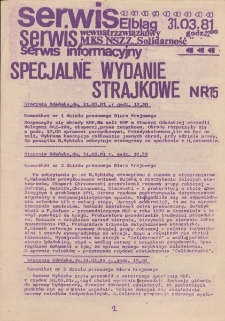Wewnątrzzwiązkowy Serwis Informacyjny MKZ NSZZ "Solidarność" od dnia 20.03 do 31.03.1981 roku w całości (wszystkie numery do nr 15) był poświęcony tzw. wydarzeniom bydgoskim i sytuacji jak wytworzyła się po tych faktach, w wyniku, których nastąpiła groźba strajku generalnego. Stąd w podtytule serwisu wpis - Wydanie Specjalne Strajkowe. W dniu 19 marca 1981 roku podczas Wojewódzkiej Rady Narodowej w Bydgoszczy dotyczącej sytuacji rolników indywidualnych w obecności wicepremiera Stanisława Macha pobito kilku działaczy "Solidarności" - Michała Bartoszcze i Mariusza Łabentowicza a także szefa regionu Jana Rulewskiego. W czasie obrad przewodniczący Edward Beger niespodziewanie zamknął sesję, na wezwanie Rulewskiego do budynku Urzędu Wojewódzkiego przybyły liczne ekipy związkowców z okolicznych zakładów pracy. O godzinie 19 milicja oświadczyła, że wobec zakłóceń porządku publicznego żąda opuszczenia pomieszczeń, gdy to nie nastąpiło ruszyła z pałkami na działaczy "Solidarności" rozdzielając ich. Ciężko pobitych działaczy odwieziono do szpitala, przybyła z Gdańska Krajowa Komisja Porozumiewawcza NSZZ "Solidarność" wydała oświadczenie, że napaść na działaczy związku była prowokacją przeciwko rządowi generała Jaruzelskiego. Chodziło o to, by uniknąć frontalnej konfrontacji z rządem i doprowadzić do ograniczenia wpływów twardogłowego skrzydła w PZPR, które całkiem jawnie żądało siłowej rozprawy ze związkiem. W ostatnim serwisie nr 15 Region Elbląski w dniu 31.03.1981 głosował za odwołaniem strajku generalnego.